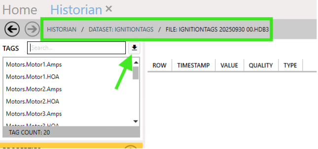 Open the historian tile, look for the white drop down arrow inside of your dataset and then inside one of the HDB files.